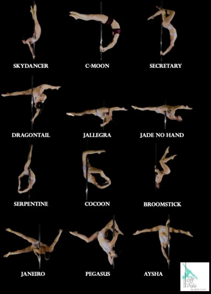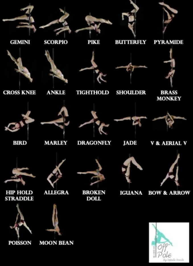 Gemini (outside), Scorpio (inside), Pike, Jade, Butterfly, Cross Knee, Cross Ankle, Inverted Crucifix, V in both top and bottom positions, Shoulder from the floor, Shoulder Dismount, Bird, Marley, Iguana, Bow and Arrow, Brass Monkey, Moon Bean, Allegra, Dragon Fly, Pyramid, Inverted Tight Hold, Hip Hold Straddle, Gemini Jump, Fish.